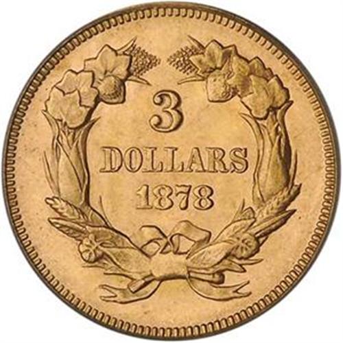 <B>$3 Gold. 1878 PCGS graded Mint State 63.</B> Minor weakness to the wreath bow and left e