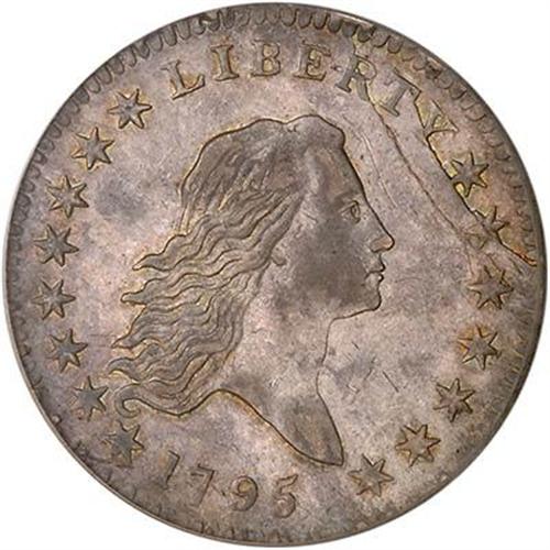 A string of die breaks connect the TY of LIBERTY with several stars on the right of this obverse. As the photograph clearly shows, Liberty is blessed with a full accompaniment of hair, including that over her brow and on the back of the head. The stars on the left are mostly sharp while those on the right hand side tend to be flat; rims, too, show unevenness in the serrations, another quite common occurrence with 1795 halves. Smooth finish, the old-silver patina shades from medium to a few areas of deeper dove or slate-gray; also there is some light brown color in the toning.