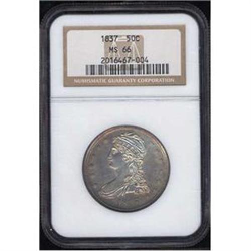 This classic American coinage issue marked the beginning of a new era in coinage with the implementation of the first steam-powered coinage press at the Philadelphia Mint. Approximately 1,200 examples of this reeded edge half dollar were produced 1836, the regular production coins minted from this press throughout 1837. From a industrial viewpoint, this new press afforded an important advance for the Mint. The uniformity of coinage reached a higher level than ever before with this Reeded Edge coinage. What's more, the equipment's precision achieved many objectives, one of these being a decline in forgeries, as those in that line were unable to obtain such precision. (The coining press that struck these coins is now on display at the museum of the American Numismatic Association in Colorado Springs, Colorado.)