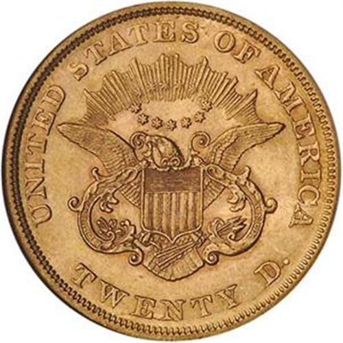 <B>$20 Gold Liberty. 1852 NGC graded Mint State 62.</B> A few light hairlines but all in al
