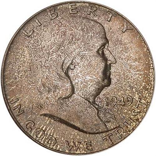 As seems likely, this naturally toned 1949 Franklin half dollar could trace to an original mint set. Those familiar with the scarce early sets find many attractively toned coins with superior luster and satin surfaces compared to the more run of the mill baggy "roll coins" (even for 1949 which tends to be better than the Denver or San Francisco branch mint issues).