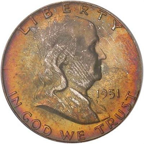 Incredible detail and sharpness cleverly advance the bloom from the dies as well as the astoundingly beautiful sunset gold and red toning of this well made Franklin half. It is a treat to behold, a thing of beauty, a coin for the connoisseur, and will no doubt offer its purchaser hours of enjoyment.