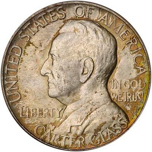 Excellent detail from a strong strike, the surfaces show sharp silver color underneath thin layers of light to medium-weight golden toning from the issue card. A resplendent Lynchburg half dollar. The portrait is that of Carter Glass, appointed Secretary of the Treasury under Woodrow Wilson to succeed former Secretary William G. McAdoo. Born to a newspaper family in Lynchburg, Virginia, Carter Glass (1858-1946) took an early and active interest in politics. He was still alive at the time this commemorative half dollar was struck. For his long support of the Federal Reserve, America's cartellized banking system, Glass became popularly known at the time as the "Father of the Federal Reserve."