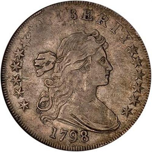 Here we see the result of die deterioration in a fine die break through the 9 of the date and also some weakness in the design (purely caused by striking inconsistencies or die bulging) along the upper left portion of the stars on the obverse. Centers are generally nice with detail, although more than a little wear shows at the topmost waves of hair above the ear and brow, as well as normal "rubbed silver" wear along the shoulder. Rims are very choice for this early issue. There is a short scuff in the field beside star 3.
