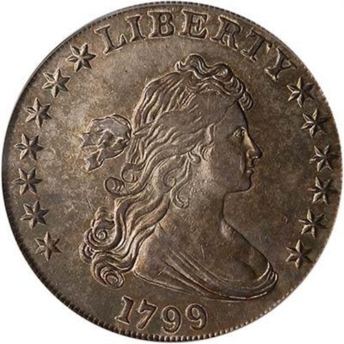 Medium to deeper shades of antique gray with some russet brown hues in the mix, a pleasing example of this turn-of-the-19th-century date and always popular with collectors. The only other 1799-dated coins are generally very scarce and expensive: large cent, half eagle, and $10 eagle, so collectors often are drawn to the affordable 1799 silver dollar. This piece has excellent detail, perhaps not quite full at the centers but surely acceptable in a coin 200 years old. The rims are first-rate as well, as is the overall appearance, the defining factor for buyers of early U.S. coins.