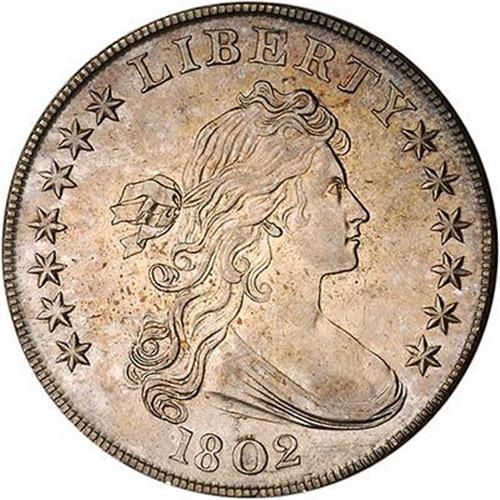 This piece displays attractive frosted-white color over the abrasion-free surfaces with light russet brown and gray patina only sufficient to reveal itself but not at all compromising the wonderful abundance of mint brilliance. In fact, both sides show nice cartwheel spin. Struck with exactitude rarely found on a 1802 dollar, all hair curls are found to be sharp, and this includes the central "lovelock" on the neck below the ear. For their part in the design, the eagle and shield are both outstanding. To say the least, this piece is extremely conservatively graded; it may just be a mint state coin (we've viewed Mint State 61 and 62 examples not as nice as the present specimen).
