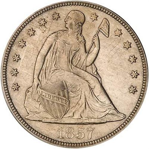 A satiny Mint State 64 specimen with faint russet and natural light silver-gray surfaces that complement the smooth, hard-working luster beneath. Some weakness of strike is seen at the top stars and portions of Liberty's hair; on the reverse, the left wing is also soft in places, but just barely so, accompanied by the often-seen faint "roller lines" on Liberty, with others across the reverse. Any marks are so few and insignificant that to mention them would be nitpicking. Far from being a commonly found issue in this condition, 1857 is elusive, almost on the point of being rare. It's low mintage explains why: only 94,000 were made.