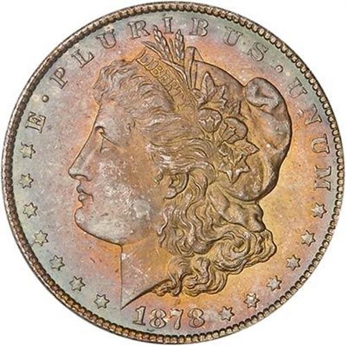 The strike on this issue is nearly always very sharp, and the present Gem is no exception. The obverse is essentially gorgeous with its vast overlay of warm golden to sky blue iridescence. Struck with exactitude by the dies.