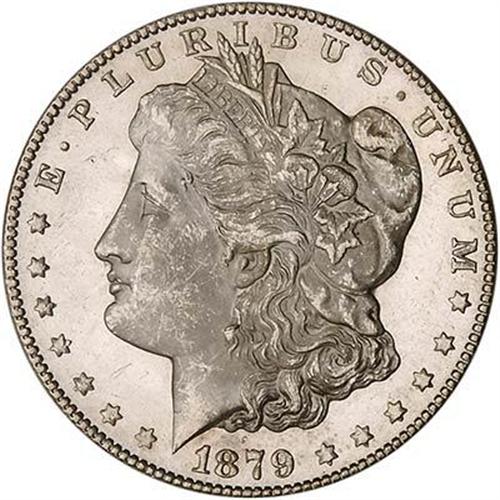 Although this issue isn't as rare or high priced as some Morgans, the 1879-CC has long been known for its scarcity. Desirable features include (beside the choice grade of MS64): stark white luster throughout without the least bit of toning and certainly no spotting; outstanding semi-prooflike fields supporting extra frosty white devices; and minimal bagmarks, with only a few light grazes in the frost of the cheek, face, and neck. What better way to spruce up your Morgan silver dollar collection than by adding this attractive specimen by way of a firm bid!