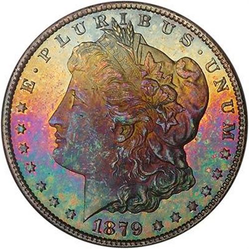 A beautifully rainbow-toned obverse; an exceptionally lustrous 1879-S that has excellent fields and devices.