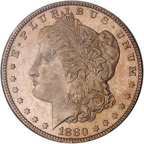 Iridescent satin to frosted white and golden brown color resonate off of the surface of this near-gem 1880-CC.