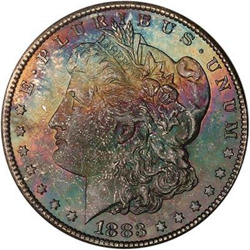 The strike is strong, with clear definition to the high points, while the surfaces are toned deep majestic shades of color on the obverse (leaving the reverse primarily stark white and glistening). Another outstanding Gem silver dollar!