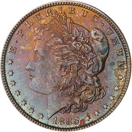 Bright mint luster characterizes the surfaces on this lovely piece and provides a base for the resplendent gold, reddish sunset and sky blue iridescence of the obverse color.. Sharp-edged devices and lettering throughout.