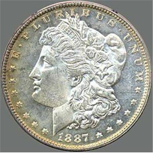Lovely shades of light gold at the rims yield to the overpowering whites of the frosted head of Liberty as well as the nice prooflike radiance in the fields of this Gem quality 1887.
