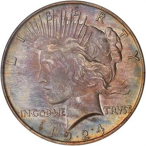 A toned Superb Gem with excellent luster and surfaces that are free from all but the most trivial luster grazes. Unlike most 1924-S dollars which were dipped at some time in the past, this gem MS66 displays outstanding toning from its years in close confinement in a roll or a bag. From that standpoint, it outranks many technically superior-grade survivors.