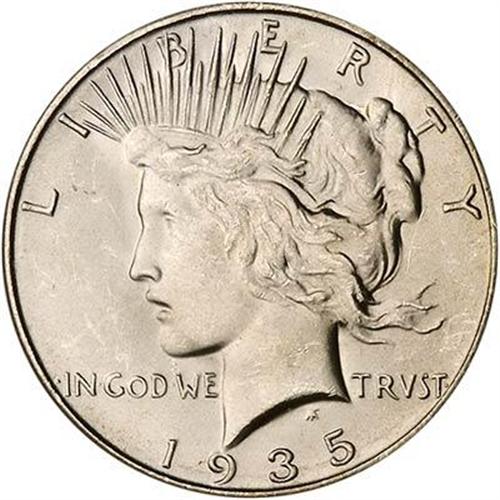 A white, untoned example, as crisp and lustrous as when it was first issued. Struck with controlled precision throughout leaving only a little roughness behind (as usual) in the central region of Liberty's tresses (above the ear) as well as the central part of the eagle's wing where it overlaps the leg joint. Final year of issue. The 1934-35 Peace dollars were struck under an emergency coinage Act of the Roosevelt administration. Once fulfillment of the act was completed, no more Peace dollars were struck; from 1936 forward, the largest silver denomination was the half dollar.