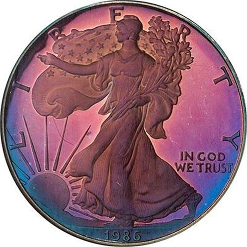The ultimate "Ultimate" in a silver $1 Eagle from the opening year of issue: astounding strike and detail, crisp two-tone frosted relief against sparkling mirrors, and color. Not just any color, mind you, but great color, heart-thumping <I>beautiful deep blue with resonating purple and rose hues on the obverse.</I> An incredible thing of beauty.