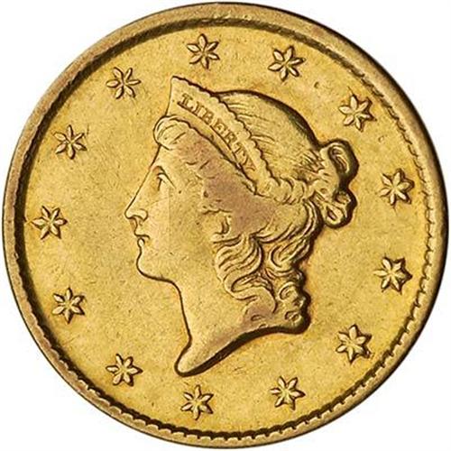 Although lustrous in the fields and generally choice, the central part of Liberty's hair is flat, as though worn, but probably this is due to weakness in the strike. Since the coin is fresh and original, there is no worry about getting stung when you bid on it, nothing hidden or objectionable to find here: that's the best sort of coin to consider for a rarities collection of United States gold coins.