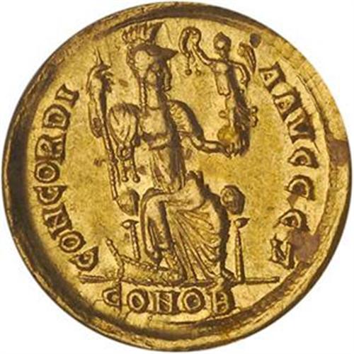 <B><FONT COLOR="#FF0000">Ancient Roman Coinage</FONT> Theodosius II, A.D. 402-450.</B> Gold Sol