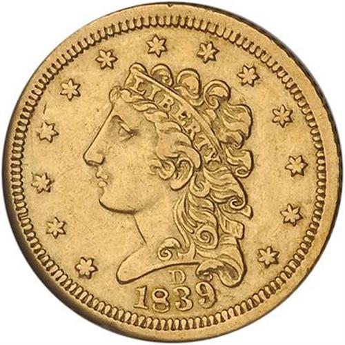 Among quarter eagles of the Classic Head type designed by William Kneass the present 1839-D stands in advance of its peers. It is clearly choice, quite well-struck, in vivid yellow gold, and with plenty of the luster remaining. The head of Liberty on this issue is somewhat unusual in its features, representing the experimentation or design tinkering that was occurring in the quarter eagle series, generally defined today by variation in the hair style. Although first modeled by William Kneass, engraver Christian Gobrecht, who by this time had taken over the day-to-day die making duties, was experimenting with the copper cent and with the gold quarter eagle, both being the smallest denominations made at the time in their respective metals. The limited mintage of quarter eagles by this Southern branch in 1839 was a mere 13,674 pieces.