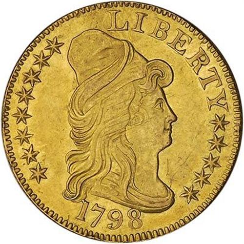 The Philadelphia Mint seemed to be operating in a state of disarray during the first few years, if the half eagles are any reflection of their operating approach. Just observe the changes taking place; with Tennessee affixed to the Union on June 1, 1796, obverse dies needed 16 stars crammed onto the half eagle, up from 15 used in 1795-96. When 1798 rolled around, the star counts continued to show a variety on silver dollars (1798s are known with 15 obverse stars and a small eagle reverse as well as a 13 star obverse with a small eagle reverse). However, on half eagles, all 1798 obverses finally settled on 13 stars (although one reverse is known displaying 14 stars, no doubt an engraving error).