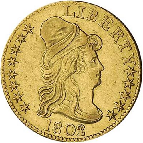 The features have close to 95% frosty luster with only a trace of cabinet friction on the top of the cap, brow and brow curl, and top parts of the eagle's wings. It could easily pass for Mint State in a collection of frosty specimens of the early $5 gold design. All 1802 half eagles trace to this single overdated obverse, with the 2 over a 1.