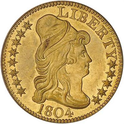 PCGS lists this as "small 8" while the Breen reference refers to it as having a "small date." Whatever your preference, you'll immediately come to see why the MS64 grade was assigned. For the coin is, without question, fresh, original, frosty and admirably well-preserved for so early a gold coin. The mint struck approximately 30,476 pieces with the 1804 date comprising of several varieties, including one with a blundered obverse having a small 8 over a much larger 8. This example of the small 8 variety has localized weakness but is otherwise complete in the stars, major hair and cap detail, and eagle definition, with lovely patina atop the greenish golden frost. Sandwiched between two more plentiful issues of 1803 and 1805, the 1804 has long been one of our favorite dates to recommend to advanced collectors. The coin is housed in PCGS holder 5645680. PCGS Population: 3; none finer.