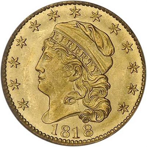 This would make an excellent choice for the collector of 19th century gold Types as this date and variety are one of the more plentiful issues of this 1813-29 design. The surfaces are attractive for the grade, and the green-gold frostiness is well-defined overall with a rim-to-rim "cartwheel" spin, a effect of the way the metal flowed into the die recesses from the center outwards. Moreover, this lovely coin has the added bonus of the interesting reverse which shows die engraving in which the words STATESOF are crowded together, almost as though they are a single word. This same crowding occurred on a dime reverse die that was used in 1814 and again in 1820. This coin would certainly make a welcome addition to any advanced collection.