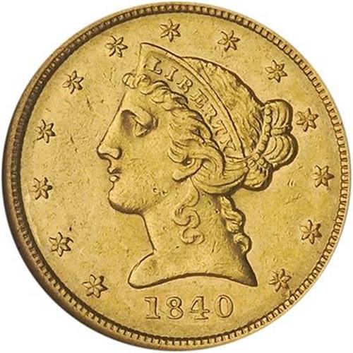 A few scattered marks on the jaw line and face, others in the field, but all in all a very well struck, ideally preserved specimen in this grade. Crisp light gold color, 10% mint luster adheres to the protected areas inside the rim, around the legends, and also within all of the main devices. This commoner "narrow mill" five is one of a mere 18,459 pieces believed to have been struck (according to Breen's assessment of the breakdown between the narrow and broad mill varieties of 1840-D).