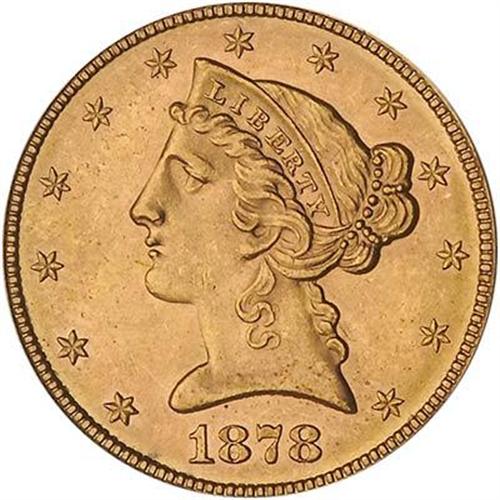 This is a well-struck example with good details for the 1878 emission. It has no bothersome abrasions or points of wear to mention other than a few tiny marks along the jaw line. Both sides display an exceptional frosty sheen and dazzling satiny brilliance, being predominately yellow-gold with a touch of reddish color, and inclining toward Mint State 65 quality in places.