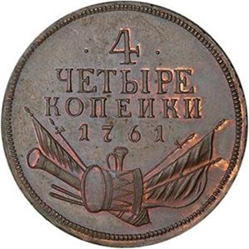 <B><FONT COLOR="#FF0000">RUSSIA</FONT> Elizabeth. Pattern 4 Kopecks, 1761.</B> Bitkin-H444. No