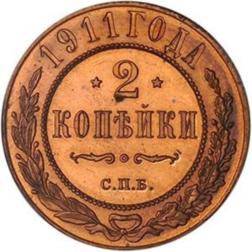 <B><FONT COLOR="#FF0000">RUSSIA</FONT> Nicholas II. 2 Kopecks, 1911-SPB.</B> Bitkin-246; Y-10.