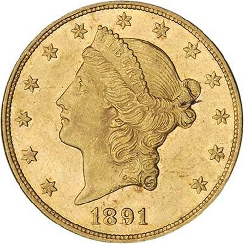 Nothing blurred or weak about this smartly made twenty from the Carson mint, nothing at all: the devices are sharp with only a couple of rounded stars; the luster more than 80% complete and therefore shining under the toning with sleek cartwheel "spin." As we mention in the other 1891-CC's description, this has very low mintage (5,000) and subsequently is elusive in the extreme in higher grades. Included with the lot is its Wayte Raymond coin envelope.