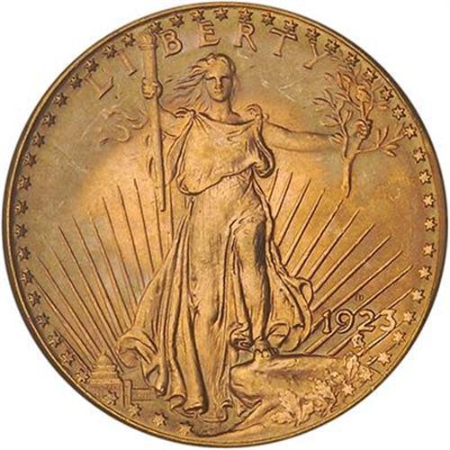 This warmly colored example displays beams of golden metallic detail in virtually all areas. Struck with mathematical precision by the dies as seen in the full drapery folds and nicely formed knee, face, and toes on Liberty, as well as an incomparably beautiful eagle. The 1923-D issue is famous for its resplendent luster and generally knock-out surfaces.