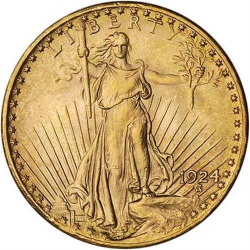The deeply struck, frosty surfaces are draped in blazing reddish-golden patina and show minimal abrasions. A sharp impression was left by the recoil of the dies that struck this 1924.