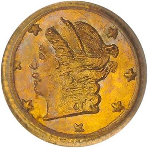 Being no stranger to this intriguing series of coins, we are happy to report that this sharp MS65 is second cousin to some of the finest examples of BG808 known, with its warm orange gold patina and frosty surface.