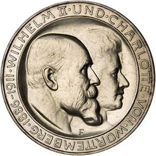 <B><FONT COLOR="#FF0000">GERMANY-WÛRTTEMBERG</FONT> Wilhelm II. 3 Mark, 1911F.</B> KM-63