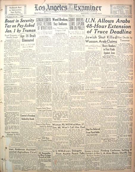 Original ''Los Angeles Examiner'' newspaper dated Tuesday 25 May 1948 reporting on the first Arab-Israeli War (also known as the War of Israel Independence). Headline reads: ''UN allows Arabs forty eight hour extension of truce deadline.'' Thirty pages newspaper measures 16'' x 21''. Good condition with some chipping to edges.