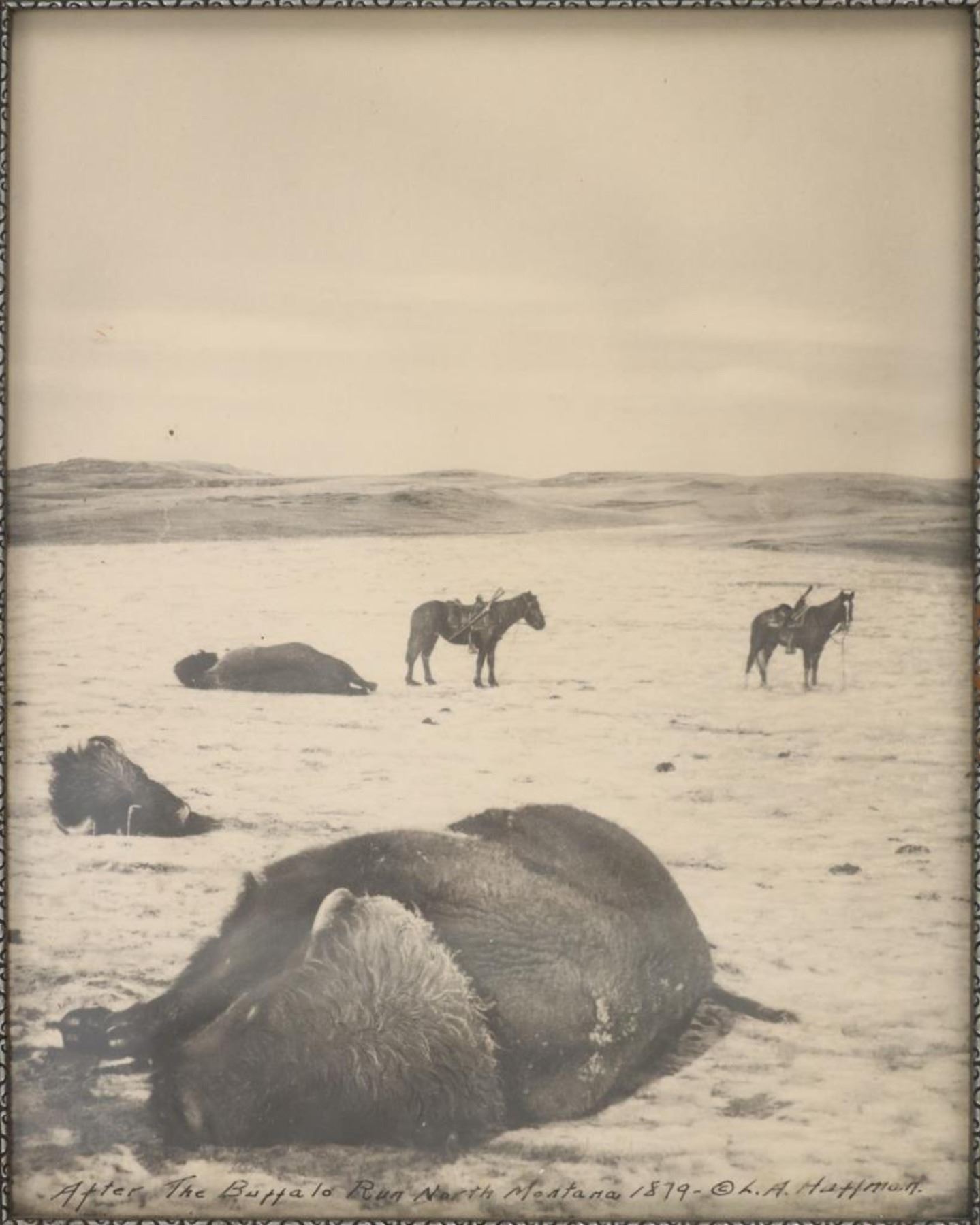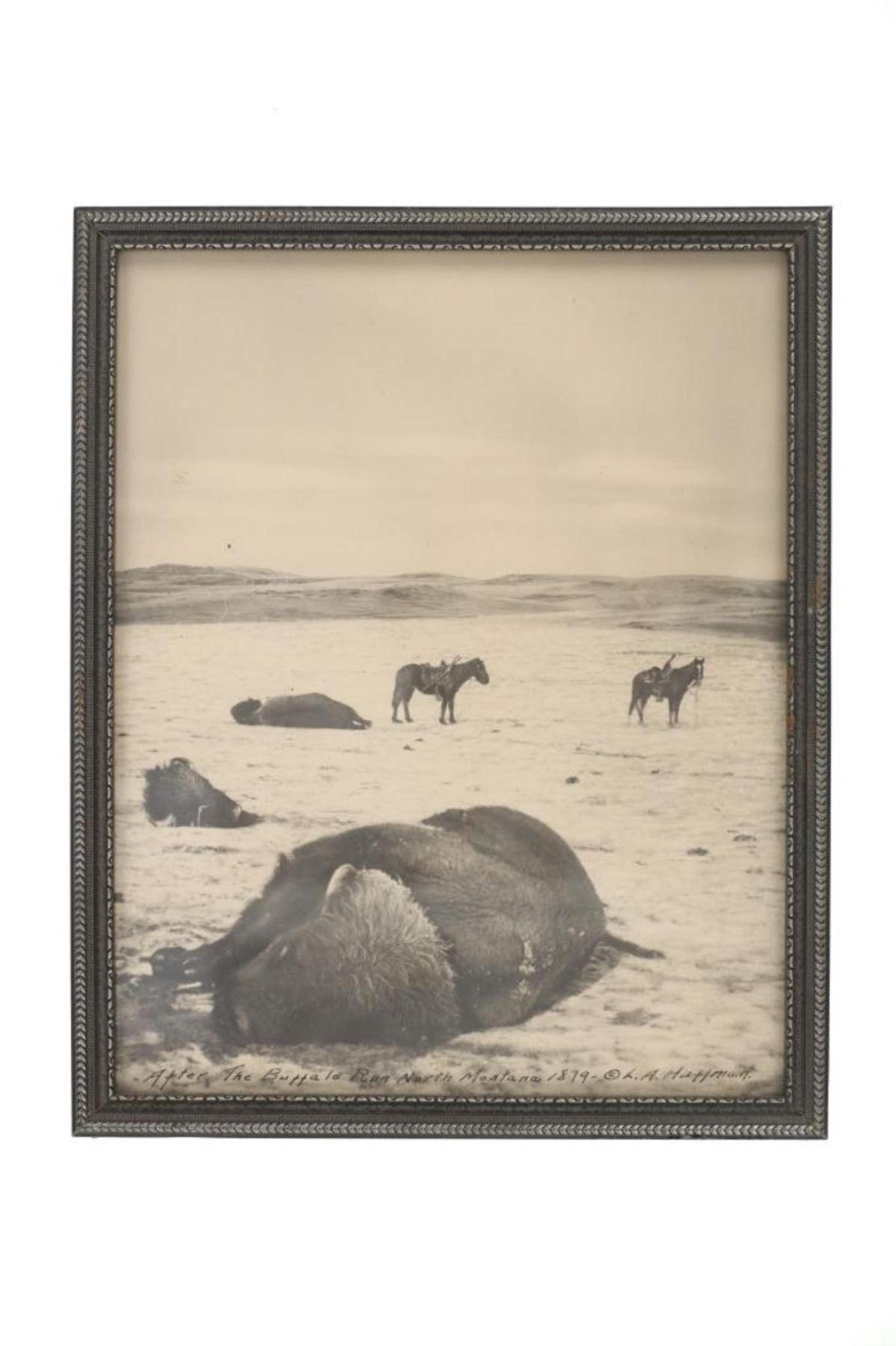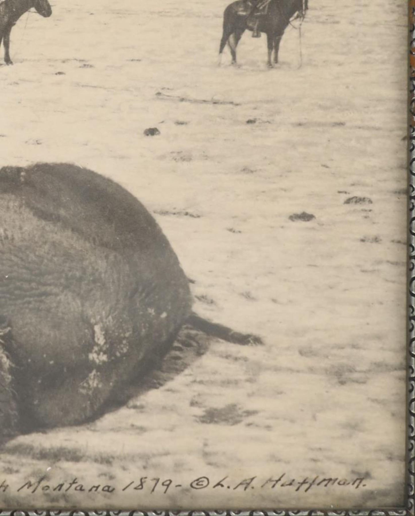 Featured in this lot is this L.A. Huffman collotype called "After the Buffalo Run" originally from 1879. The collotype features a scene after a Buffalo Run with dead buffalo on a snow covered field with two unmounted horses with the rifles in their scabbards. The bottom of the collotype is hand written with: After The Buffalo Run North Montana 1879 - L.A. Huffman. The condition of this L.A. Huffman collotype is well preserved with no obvious signs of damage to the collotype and shows minor wear to the frame. The measurements of this 10 5/8" x 8 5/8" and the visible collotype measures 9 5/8" x 7 5/8". The collective weight of this collotype is 14oz. Provenance: From the John Kleinschmidt collection which was on loan to the C.M. Russell Museum from 1987 to 1993 and included in the "The Cowboy West: 100 Years of Photography 1992-1993 exhibit.