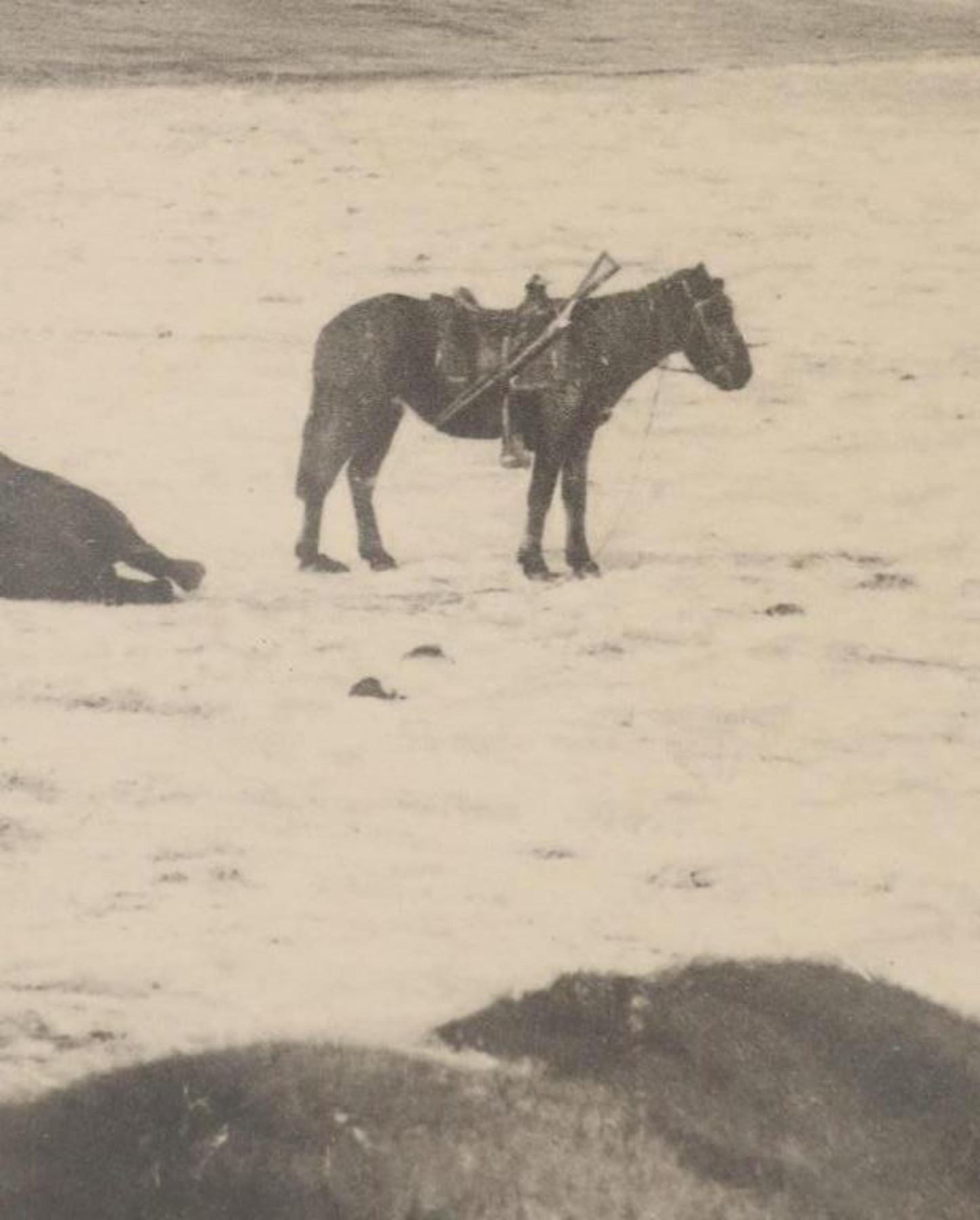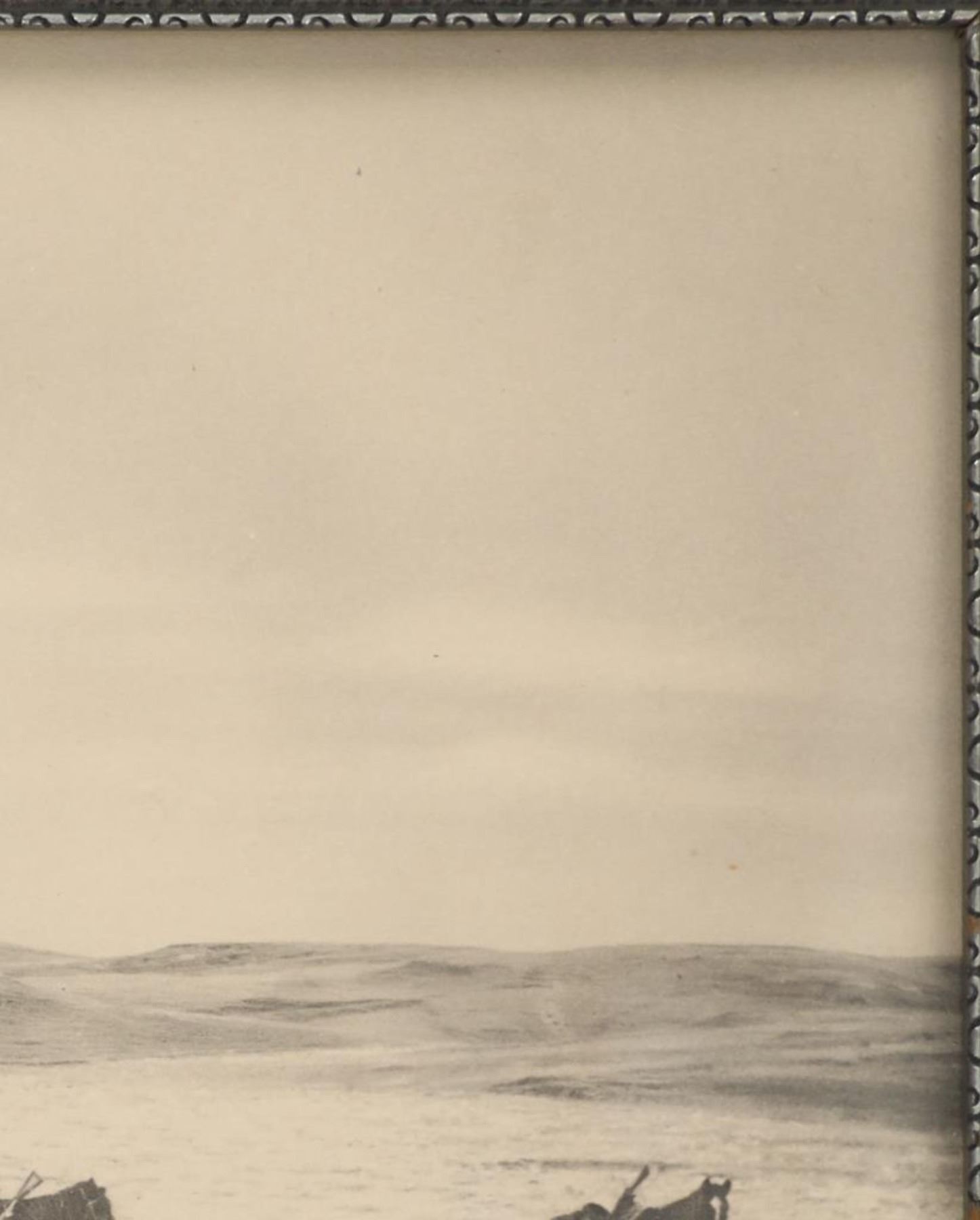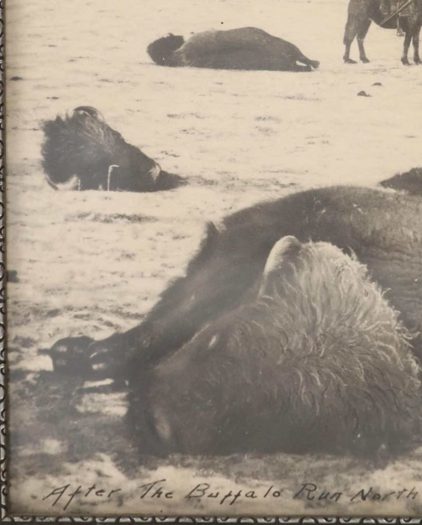 Featured in this lot is this L.A. Huffman collotype called "After the Buffalo Run" originally from 1879. The collotype features a scene after a Buffalo Run with dead buffalo on a snow covered field with two unmounted horses with the rifles in their scabbards. The bottom of the collotype is hand written with: After The Buffalo Run North Montana 1879 - L.A. Huffman. The condition of this L.A. Huffman collotype is well preserved with no obvious signs of damage to the collotype and shows minor wear to the frame. The measurements of this 10 5/8" x 8 5/8" and the visible collotype measures 9 5/8" x 7 5/8". The collective weight of this collotype is 14oz. Provenance: From the John Kleinschmidt collection which was on loan to the C.M. Russell Museum from 1987 to 1993 and included in the "The Cowboy West: 100 Years of Photography 1992-1993 exhibit.
