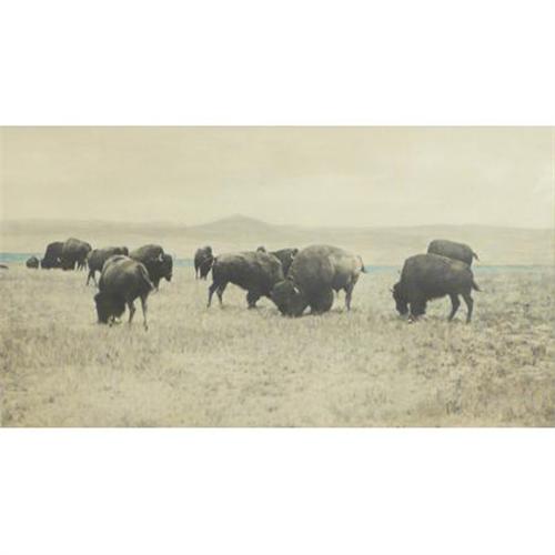 Laton A. Huffman (1954-1931) Handcolored Collotype of Buffalo in Montana Signed bottom 7" x 13 1/2"