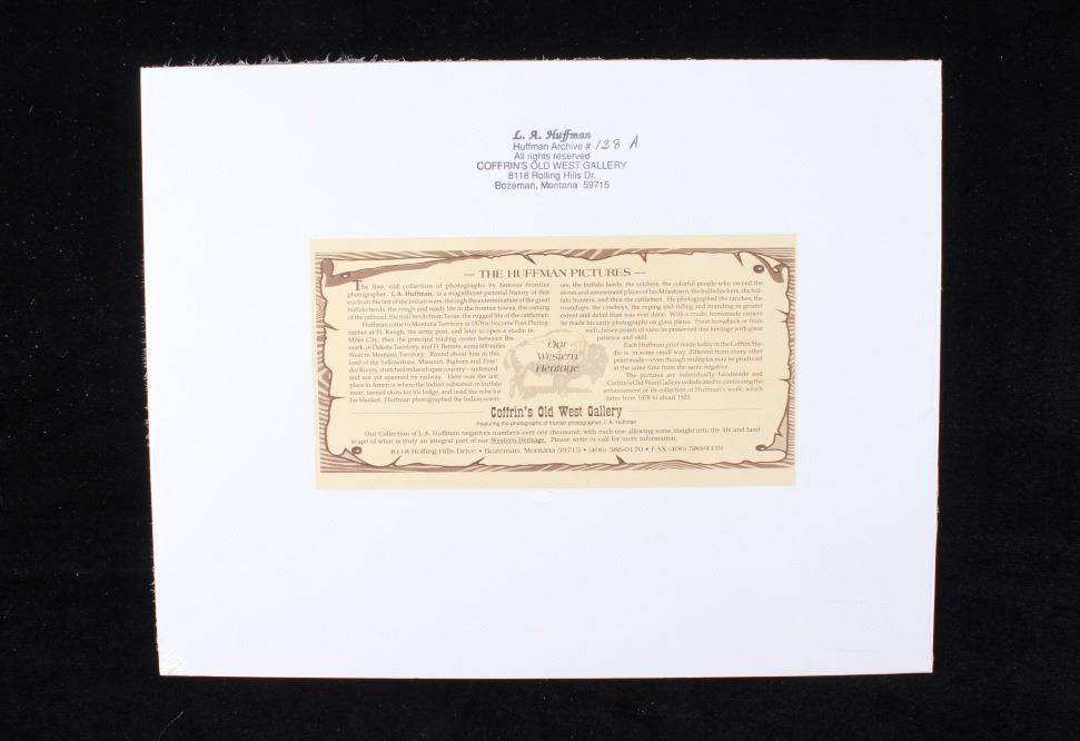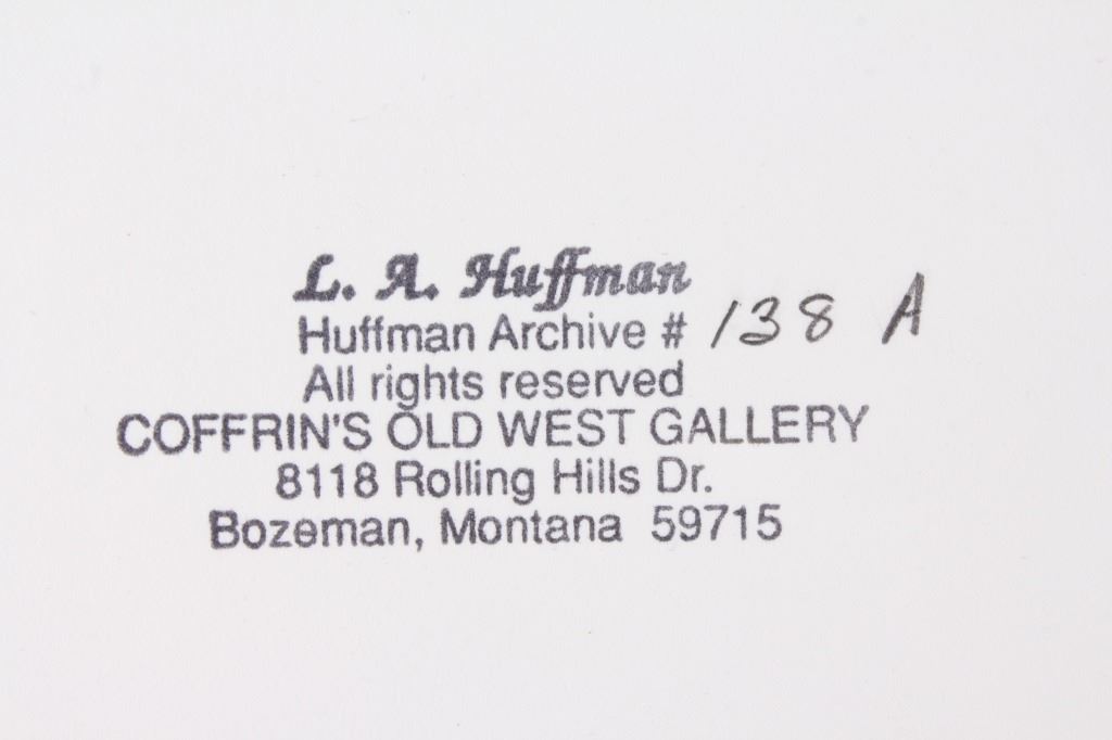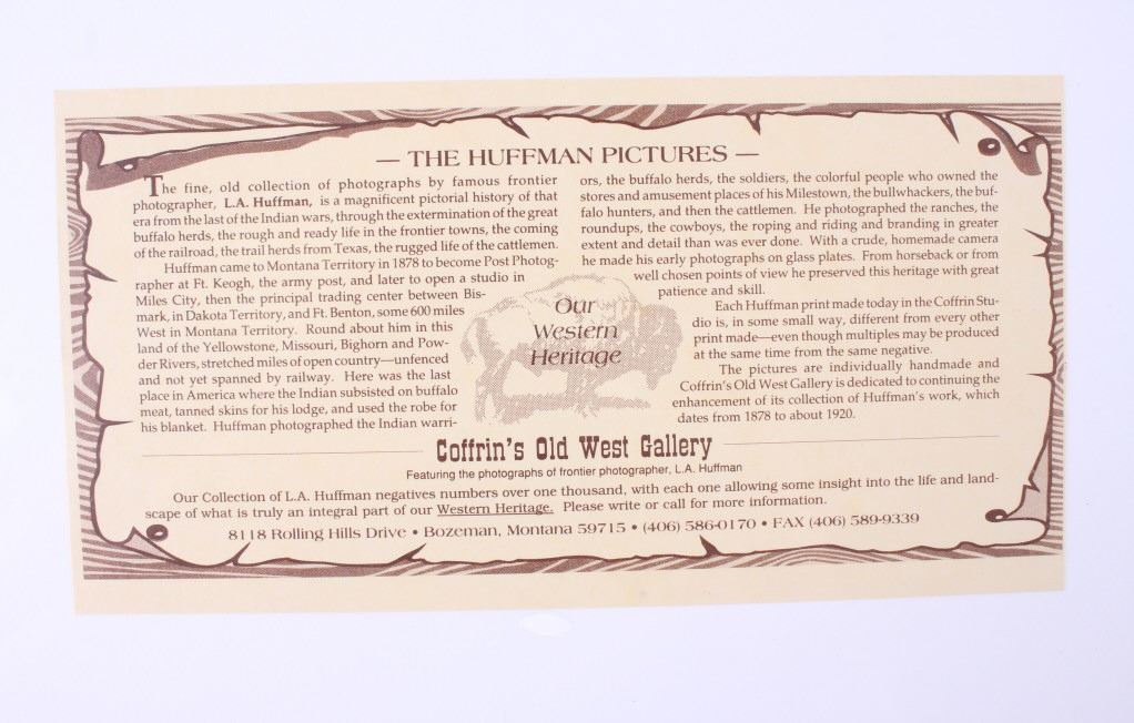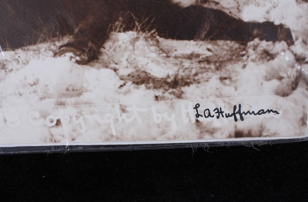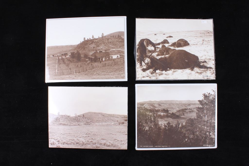 For your consideration is this collection of photos by L.A. Huffman circa 1890-1901, these pictures were taken by L.A Huffman whose work dated from 1878-1920. The Coffrin's old west galleries collection of Huffman negatives is one of the largest in existence today. these negative reproductions are offered to the public in a variety of sizes. Originally started in Miles City, Montana Coffrin's old west gallery relocated to Bozeman, Montana in 1991. The first photograph is titled "Taking The Tongues" and shows a buffalo hunter taking dead buffalo tongue. The second photograph isn't titled but shows a photograph of a ranch built at the base of the hill. The next photograph is titled "The O.W. Ranch on Hanging Woman Creek - 1890" and shows the ranch set up on the base of a hill. The last photograph is titled "The Cheyenne Agency, Lame Deer, Montana - 1901" and shows a beautiful scenic photo of a lush green valley. The condition of the photos in this collection are good with all the photos shown behind plastic wrapping and are in great display condition. The measurements of the photos in this collection are 11" x 14".
