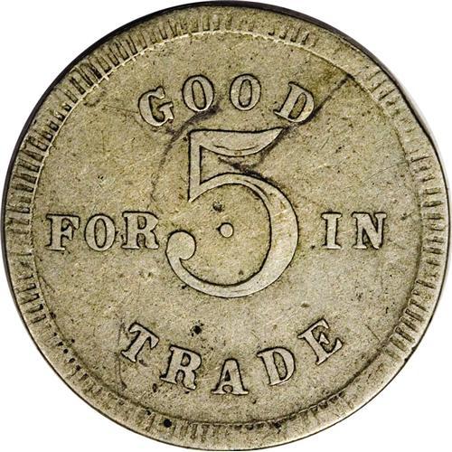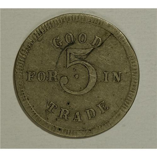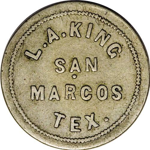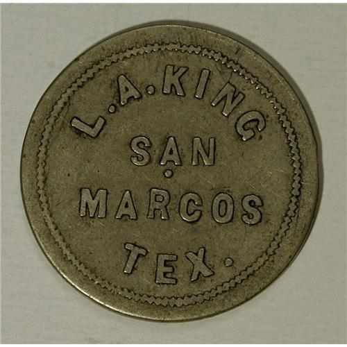 <B>L.A. King, San Marcos, Texas, Good For 5 in Trade.</B></I> This is a 24-mm German silver token ca. 1890s, but we were unable to find a reference to this token in the standard reference catalogs on Texas tokens.<BR><BR><b>Shipping:</b> Coins & Currency (<a target="_blank" href="http://www.heritageauctions.com/common/shipping.php">view shipping information</a>)