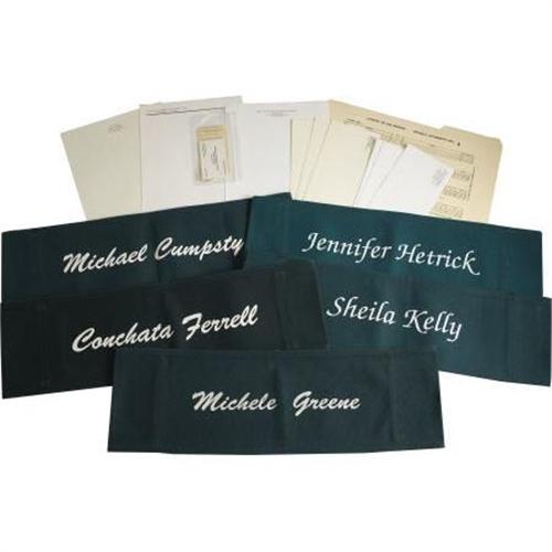 <B>"L.A. Law" Props and Actors' Chairbacks.</B></I> Before there was <I>Boston Legal</B></I> there was <I>L.A. Law</B></I> (1986-94), the TV series that tracked the cases and characters from a swanky, Southern California law firm. This lot features the green, denim chairbacks that the actors sat in on-set between scenes, each with "LA LAW" silk-screened in large white letters on the front and one of each with the following names individually screened on the backs: Michelle Greene, Conchata Ferrell, Sheila Kelly, Jennifer Hetrick and Michael Cumpsty. Also, a collection of letterhead and envelopes imprinted with the law firm McKenzie, Brackman, Chaney, Kuzak and Becker; Douglas Brackman, Jr. Attorney at Law; The Law Offices of Abby Perkins; as well as the business cards of Michael Kuzak, Victor Sifuentes, Arnold Becker, Jonathan Rollins, Leland McKenzie, Abby Perkins, Stuart Markowitz & Roxanne Melman, all contained within a County of Los Angeles District Attorney's file folder. Acquired from Steven Bochco Productions in the final year of their production. <I>Authenticated by the world's foremost curators of television artifacts, The Comisar Collection of Beverly Hills.</B></I><BR><BR><b>Shipping:</b> Clothing, Costumes & Jerseys (<a target="_blank" href="http://www.heritageauctions.com/common/shipping.php">view shipping information</a>)