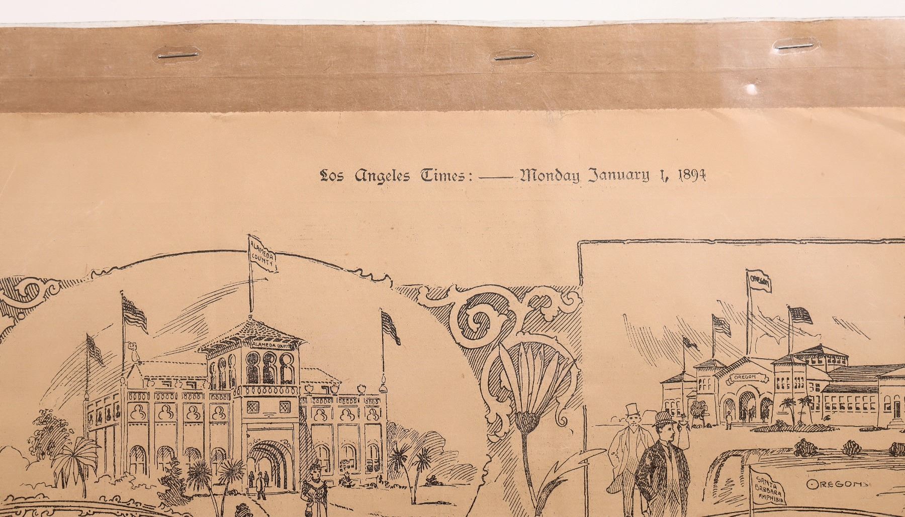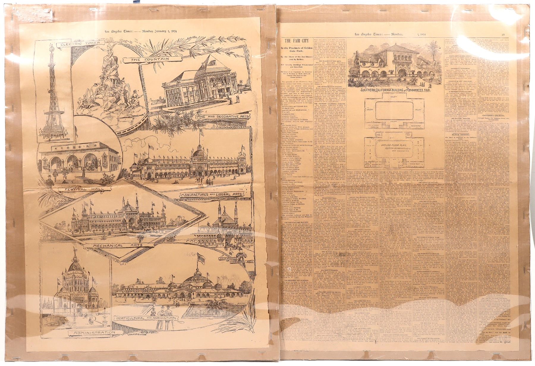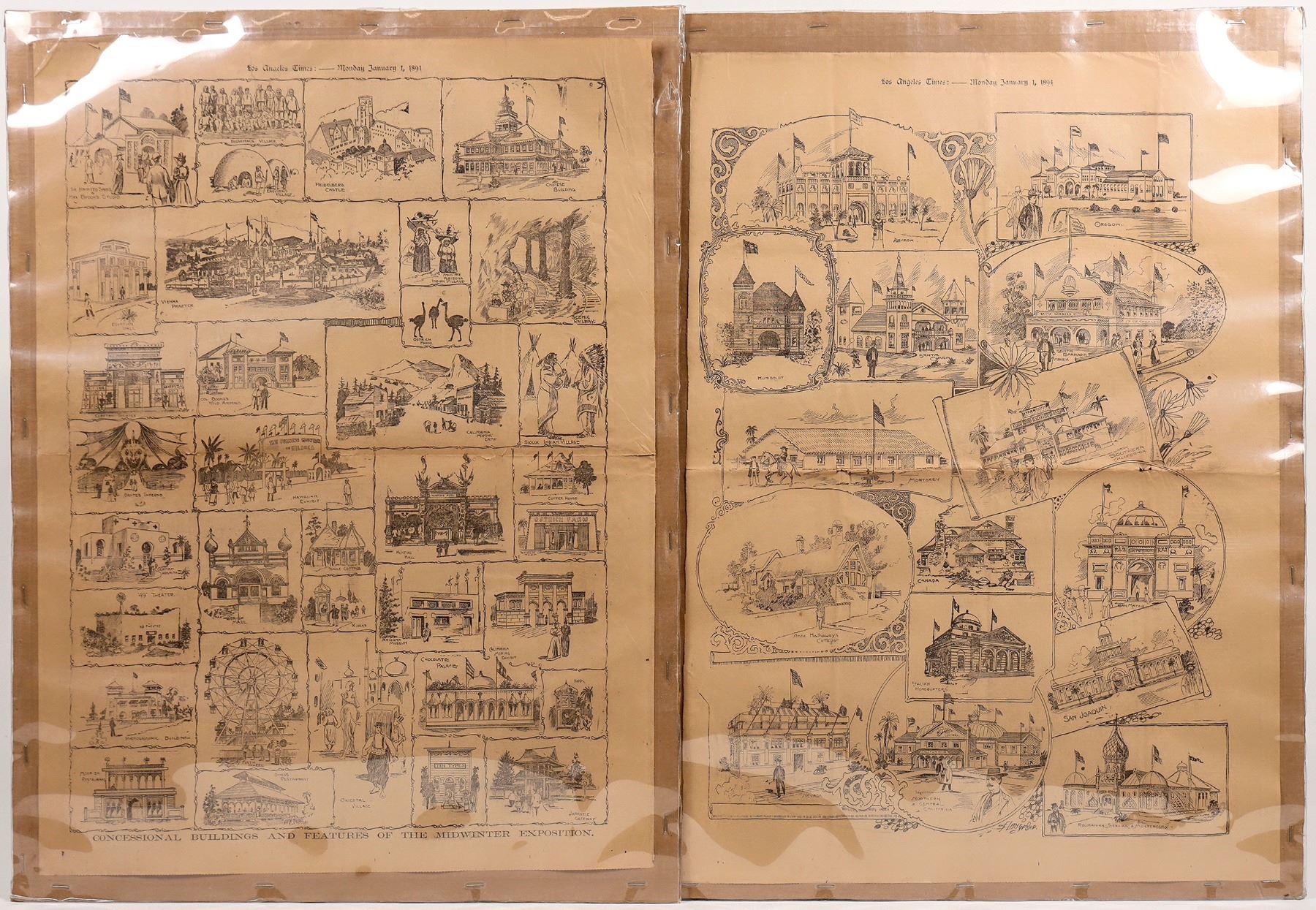 Newspaper pages from the Monday January 1, 1894 Los Angeles Times, highlighting the 1894 Midwinter Fair in San Francisco. There are several illustrations of the buildings and exhibits for the event that went from January 27 to July 5, 1894. Of the many buildings that were constructed for the exposition, only the Japanese Tea Garden and The DeYoung building in Golden Gate Park are still standing. A very interest group of illustrations. Please see photos for more details.