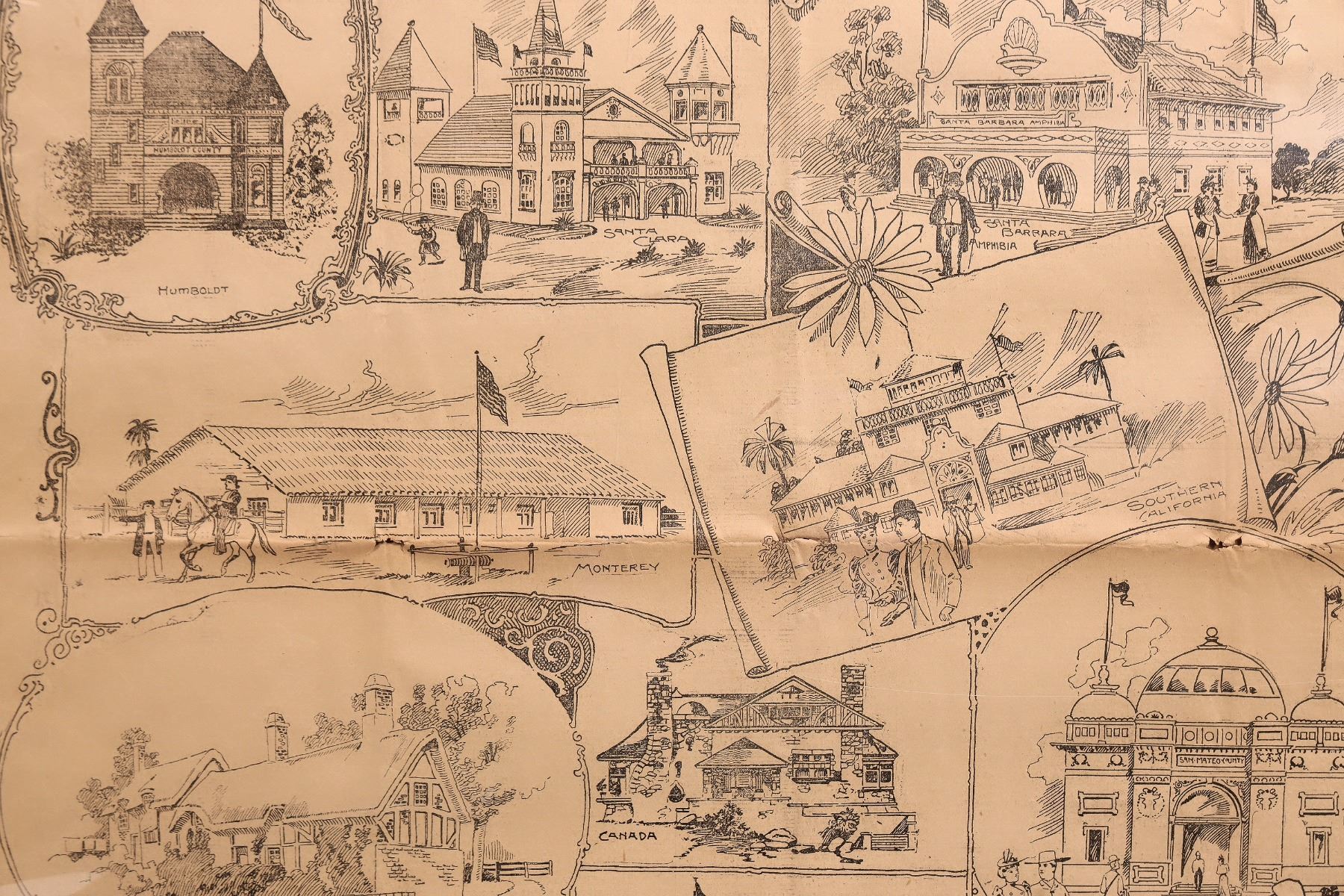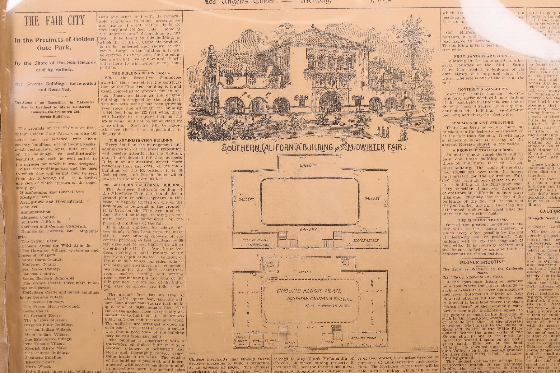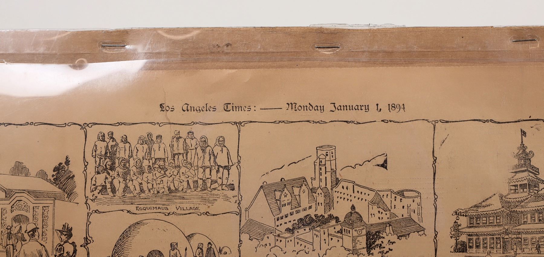 Newspaper pages from the Monday January 1, 1894 Los Angeles Times, highlighting the 1894 Midwinter Fair in San Francisco. There are several illustrations of the buildings and exhibits for the event that went from January 27 to July 5, 1894. Of the many buildings that were constructed for the exposition, only the Japanese Tea Garden and The DeYoung building in Golden Gate Park are still standing. A very interest group of illustrations. Please see photos for more details.
