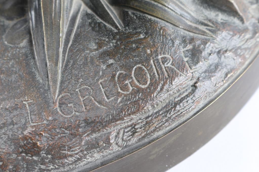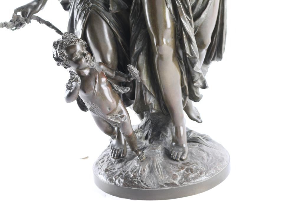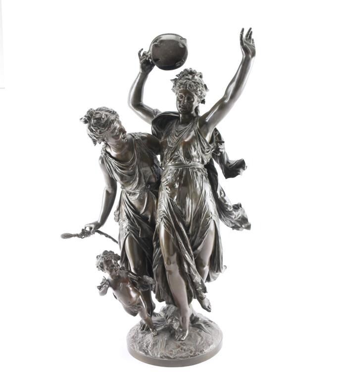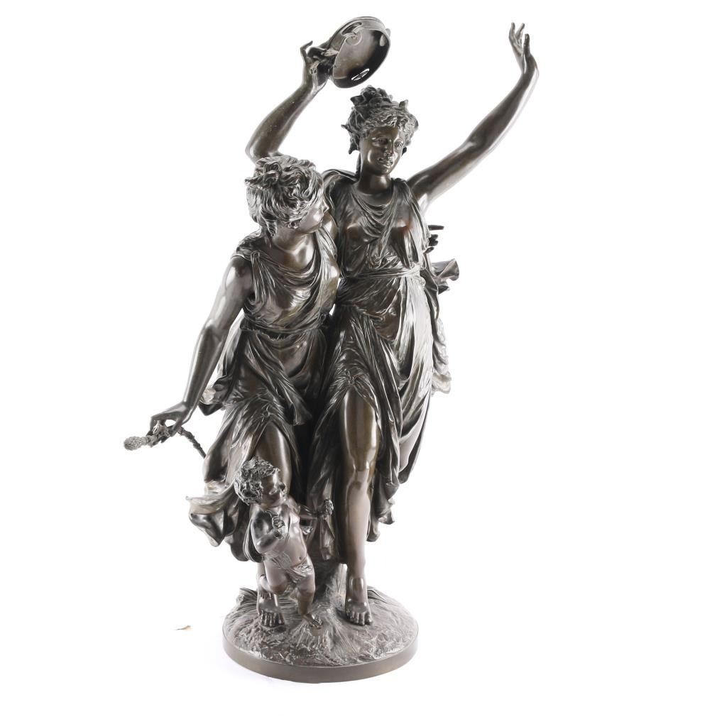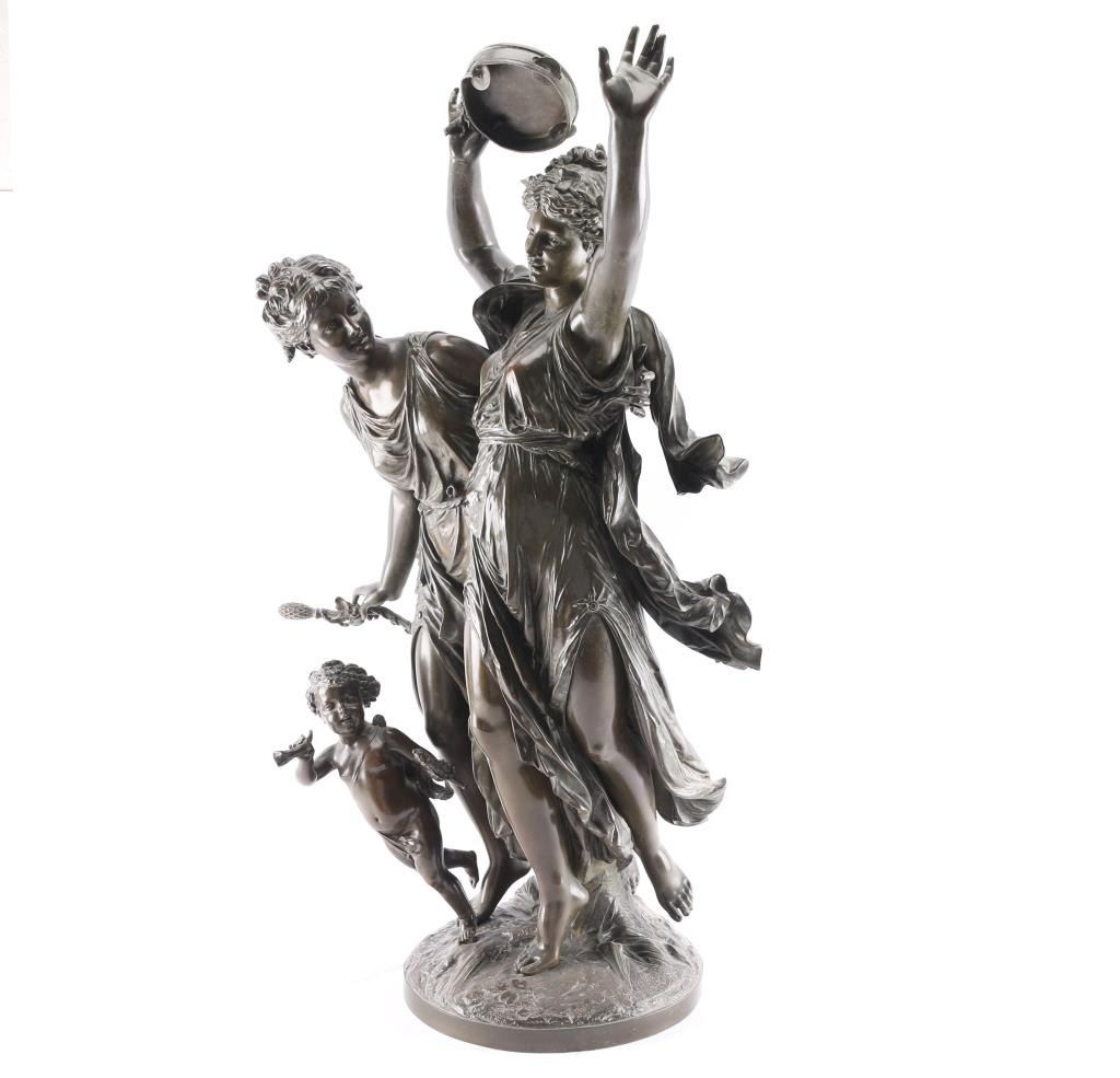 Signed on base. Measures 35 1/2" tall by 23" at widest. Cast as a pair of dancing Bacchante, one with her arms raised and holding a tambourine, the other holding a vine-wrapped staff, a putto with a horn at their feet on the naturalistically cast circular base. The tambourine has minor damage on front and the lady on right has a loose right arm. Otherwise, excellent condition. **LOCAL PICK UP ONLY; OR BUYER MUST ARRANGE SHIPPING**