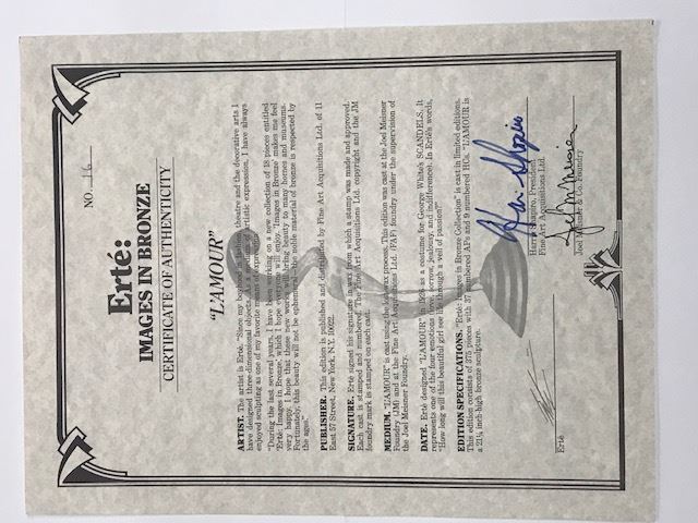 "L'Amour" by Erte Bronze. Limited Edition #16 of 375 - 21" x 8" x 5" - Erte designed "L'Amour" in 1926 as a costume for George White's "Scandals". It Represents one of the four emotions (love, sorrow, jealousy and indifference). In Erte's words "How long will this beautiful girl see life through a veil of passion?" - Certificate of Authenticity Included