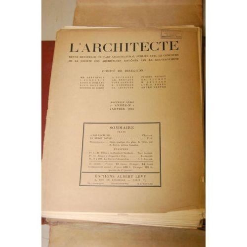 L'Architecture Revue Mensuelle De L'Art Architectural Publiee Avec Le Concours De La Societe Des Architectes Diplomes Par Le Gouvernement - 17 Issues. Paris: Editions Albert Levy, Folio - over 12" - 15" tall. Soft Cover. Ex-Library. Good Condition. With original covers (Jan. 1924 lacks back cover). No. 1 January 1924 - consecutive to No. 10 October 1924, No. 12 Dec. 1924, No. 4 April 1926, No. 3 March 1927, No. 10 Oct. 1927, No. 12 Dec. 1927, No. 2 Feb. 1928, No. 4 April 1928. Photographic plates of architecture, unbound as issued, in a portfolio with ties.