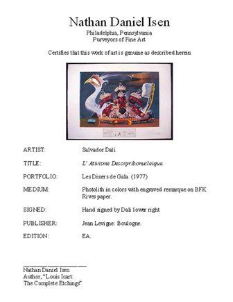Photolith in colors with engraved remarque on BFK Rives paper. Hand signed on lower right by Dali. Limited edition EA. Comes with COA. Beautifully framed and matted.